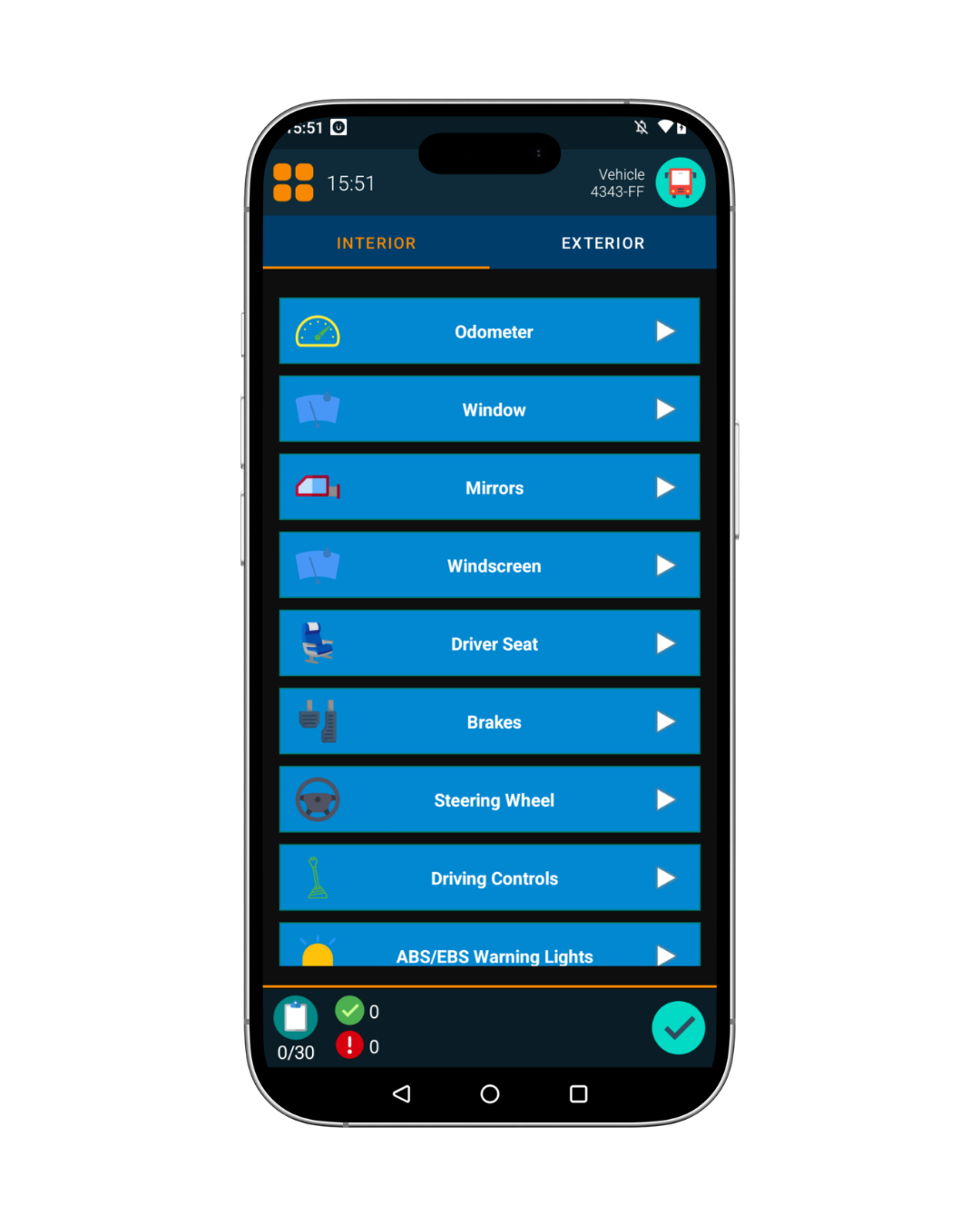 - Guided inspection flow covering interior and exterior checks
