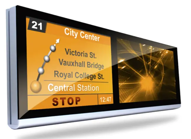 This display is placed inside the bus and provides passengers with a real-time feed of the current location of the bus. It can also provide information on the sequence of the next stops along with the time it will take for each stop.