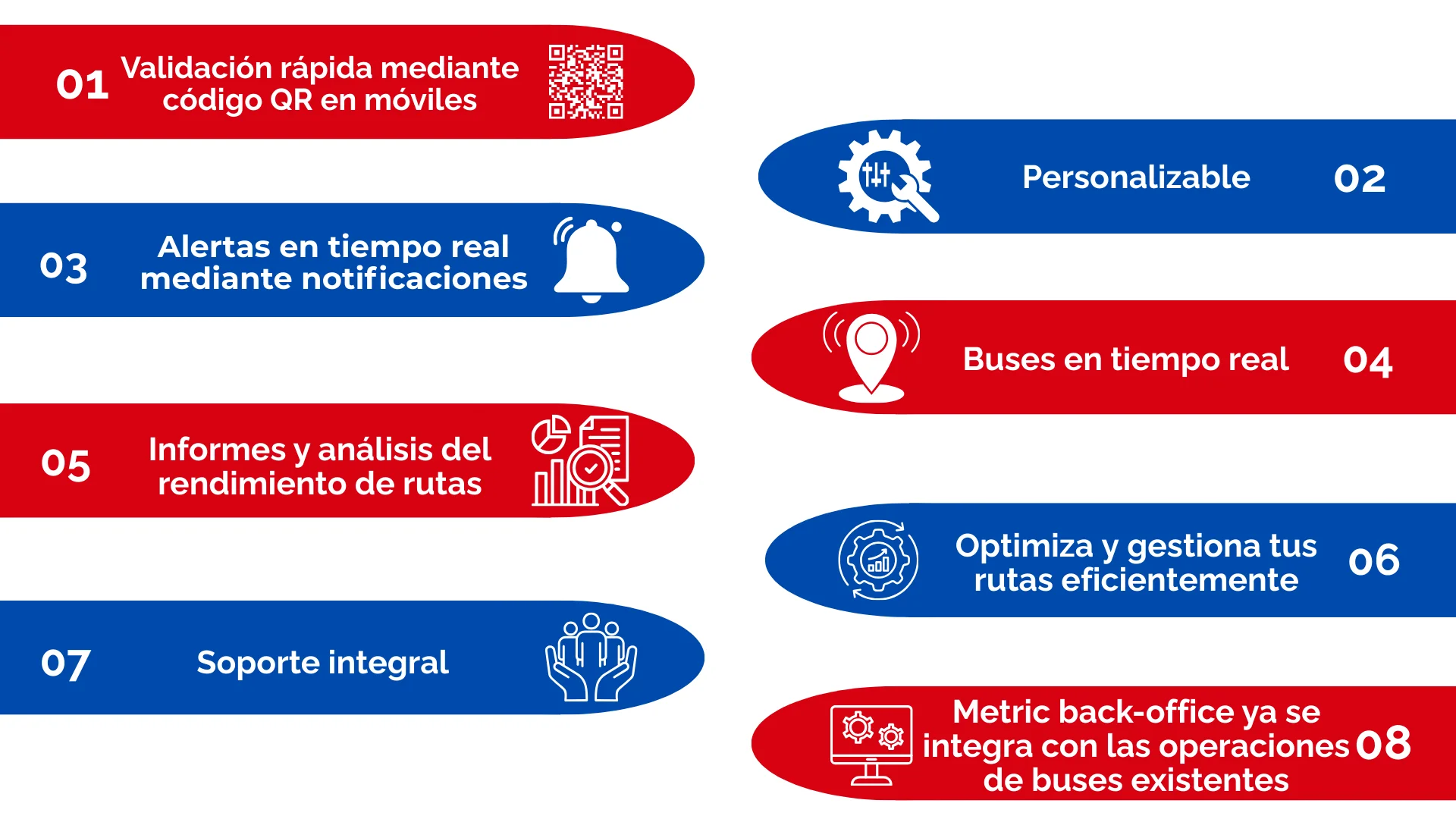 Los métodos de validación, como códigos QR, carteras móviles, tarjetas correspondientes, llaveros, etc., se registran en la aplicación del conductor. El recuento de pasajeros se registra en cada parada, junto con otros indicadores, como la puntualidad, que se almacenan en el back-office por cada viaje.